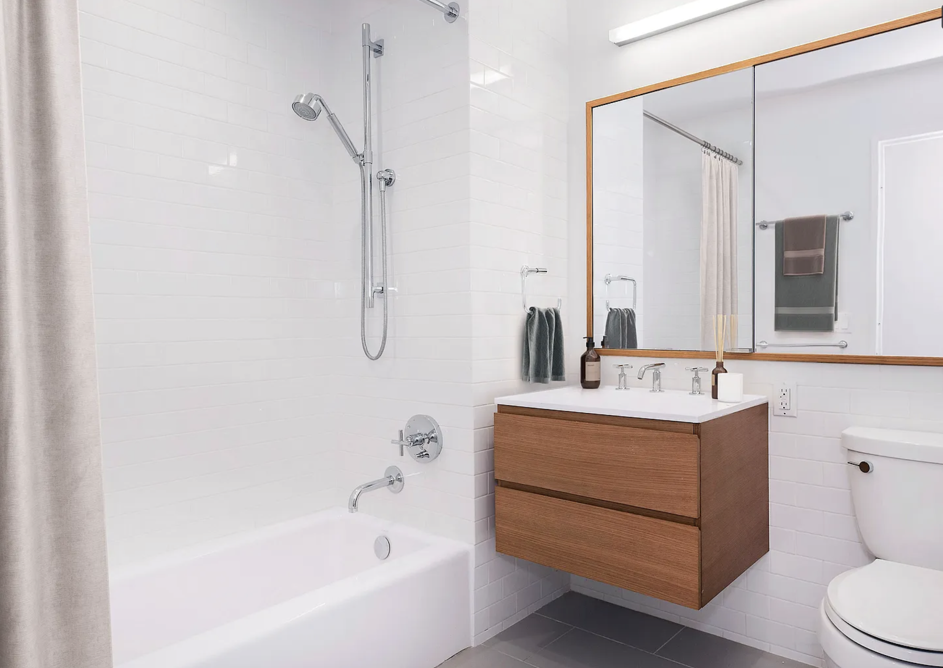 - Clean aesthetic with white subway tile, and modern bamboo fixtures. Stainless steel waterfall shower & taupe colored large tile.