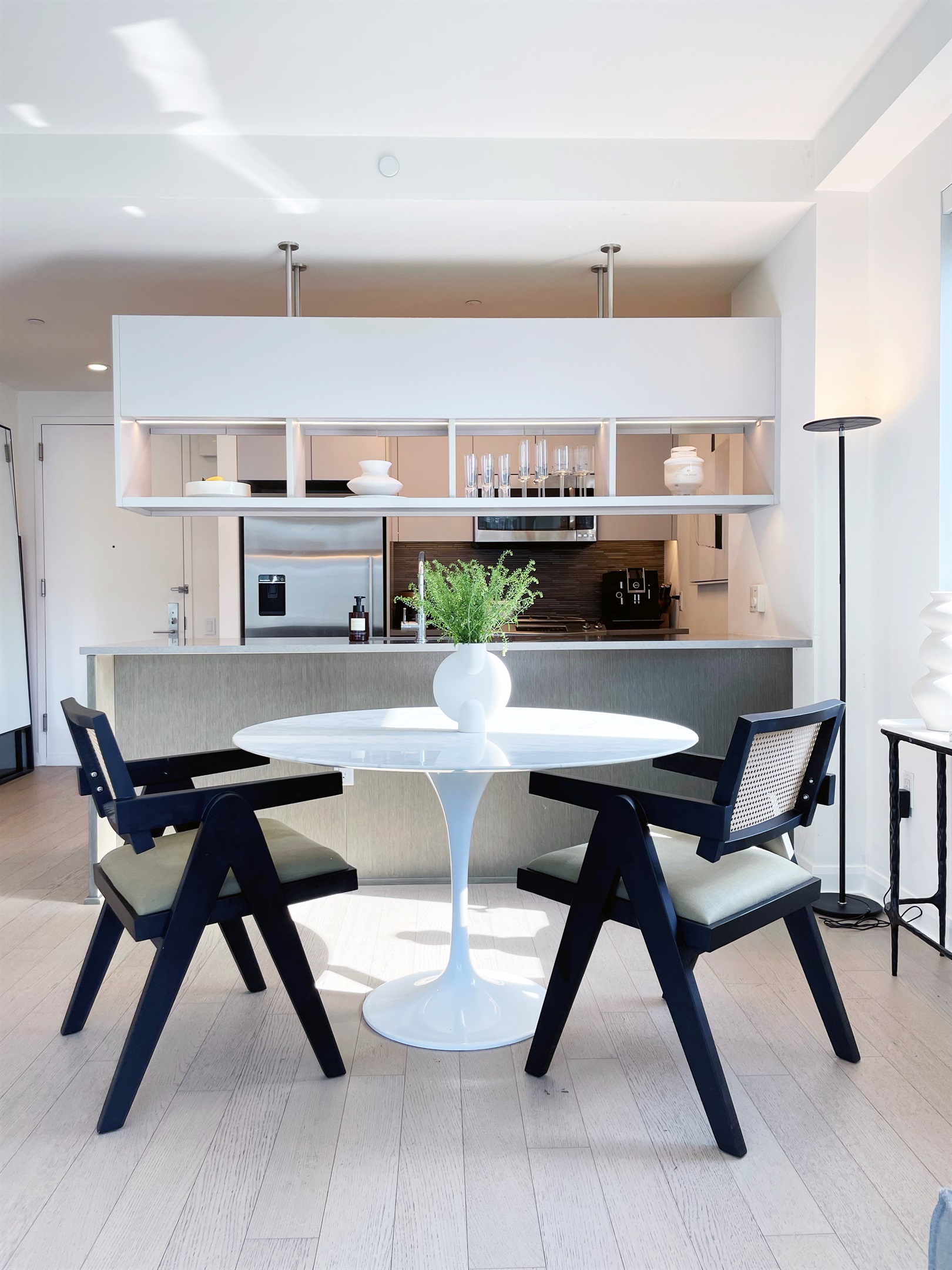 Living Room: This apartment features a 42" Carrera marble dining table, with Rove Concepts chairs. A Rove Concepts cough with a 42" Samsung SmartTV. Enjoy custom ripple fold linen curtains. Central heat & Air conditioning.